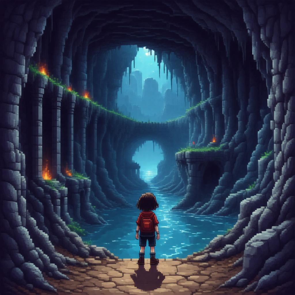 "Generate an image of the Underground from Undertale, a vast underground world filled with monsters and ruins, with a nostalgic and pixelated 8-bit style reminiscent of classic RPGs, featuring a faint image of Frisk, the main character, in the foreground, with a subtle gradient of dark blues and purples to represent the game's somber and mysterious atmosphere."