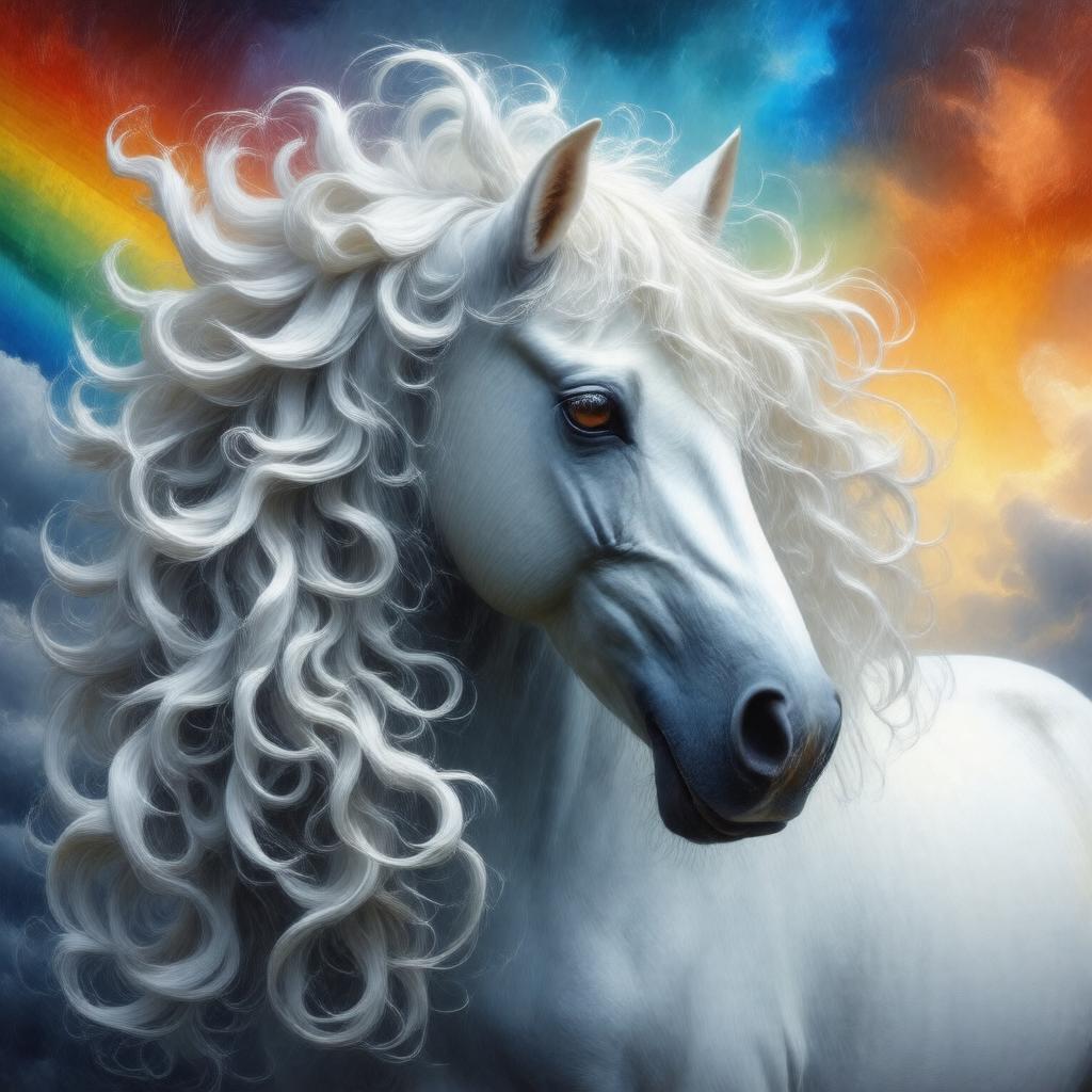 "Generate an image of a majestic, white, horse-like creature with a single spiraling horn on its forehead, set against a vibrant rainbow-colored background, symbolizing purity, grace, and innocence, in a whimsical and fantastical style reminiscent of medieval bestiaries and children's literature."