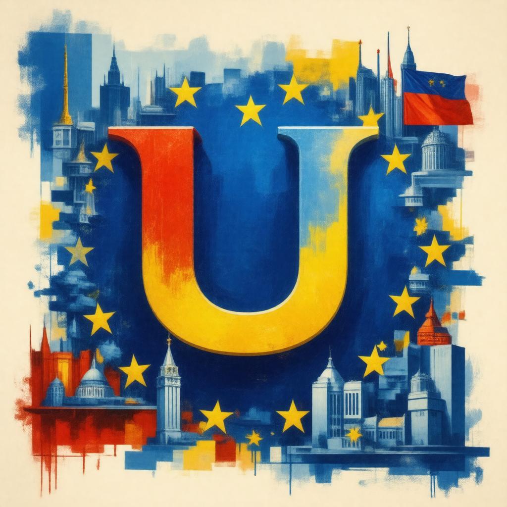 Generate an image of a stylized logo or emblem representing the "United Together" (UT) political party from Moldova, founded in 2023. The logo should incorporate elements that reflect the party's pro-European ideology. Use a modern, sleek design style with the colors of the Moldovan flag (blue, yellow, and red) or European colors (blue and yellow). Include a prominent, stylized letter "U" or a unity symbol, surrounded by or intertwined with elements that evoke European integration, such as the European Union flag or stylized representations of Moldovan and European landmarks. The overall design should convey unity, progress, and European aspirations.