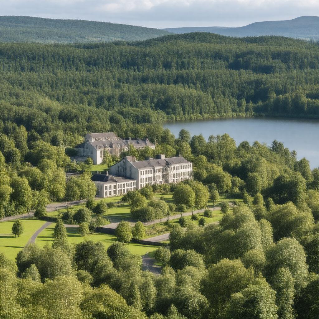 "Generate an image of the University of Stirling, a public university located in Stirling, Scotland, with a scenic campus set amidst the Airthrey Estate, featuring modern architecture, lush greenery, and overlooking Airhrey Loch, incorporating the university's colors, green and white, in a realistic style."