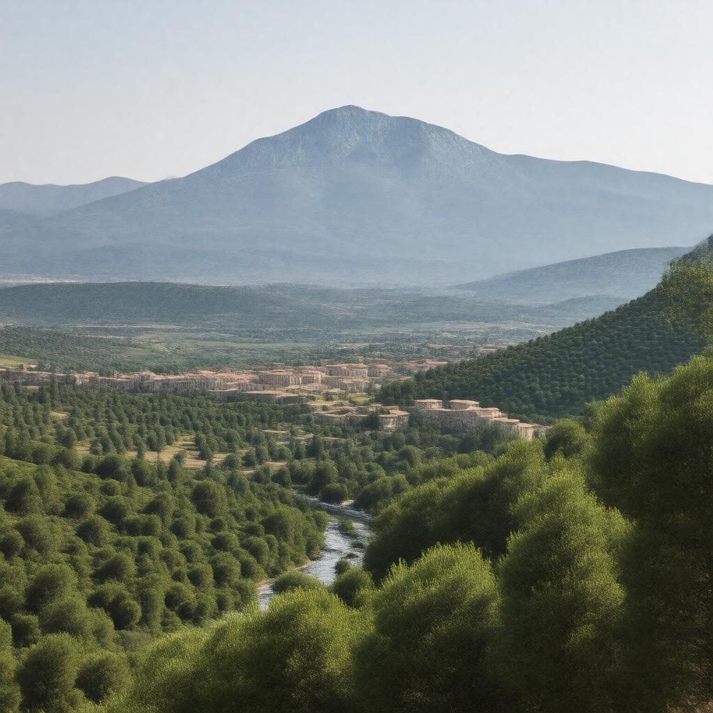 "Generate an image of a serene landscape in the Upper Galilee region, featuring a mountainous terrain with lush forests, winding streams, and scenic views. In the distance, include the majestic Mount Meron, the highest point in the region. In the foreground, depict the historic city of Safed with its ancient synagogues, and a few kibbutzim, such as Kibbutz Yiftach or Kibbutz Dan, nestled among the hills. Capture the essence of this nature reserve-rich area, with hints of the Mediterranean climate and high elevation, in a realistic and breathtaking style."