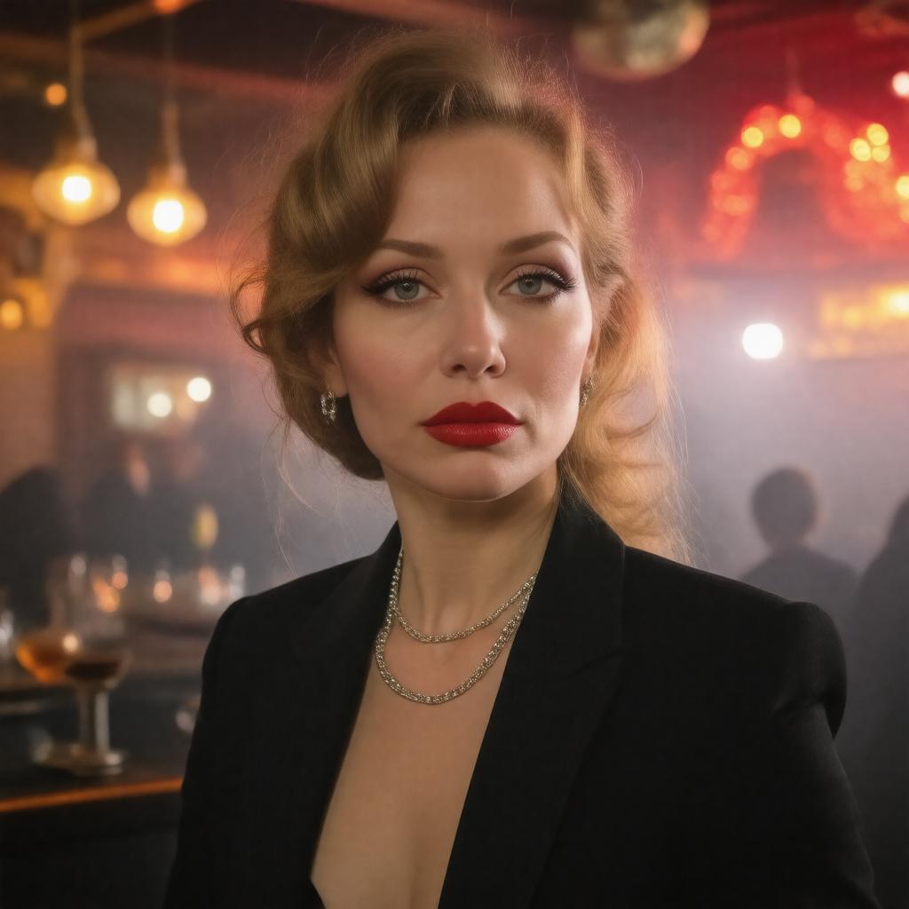 "Create a realistic portrait of Ute Lemper, a German singer, actress, and dancer, in a stylish nightclub setting, inspired by the cabaret and jazz genres she is known for, with a hint of 1920s Berlin flair, reminiscent of her influences Marlene Dietrich and Lotte Lenya, and a nod to her notable works in musicals like Chicago and Cabaret."