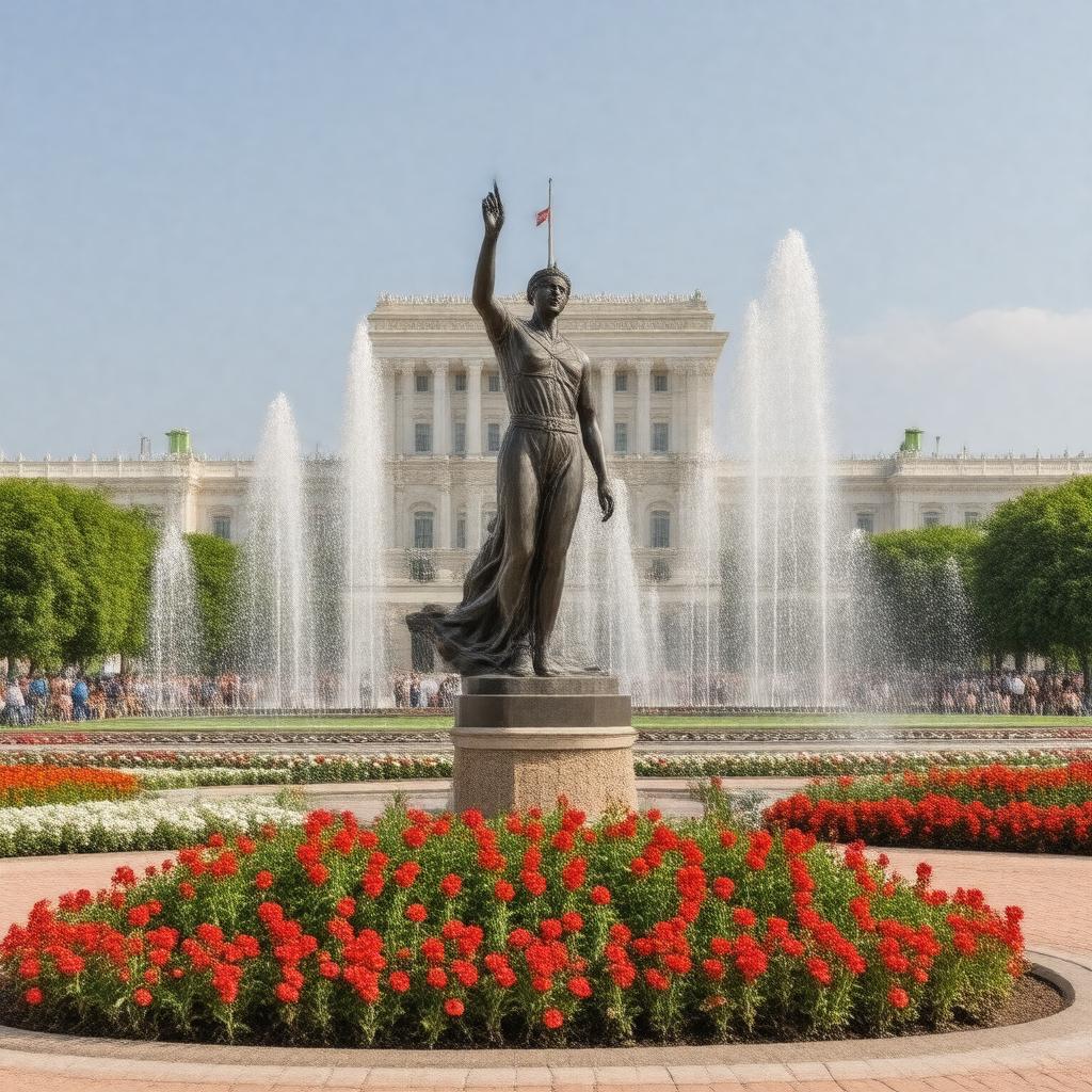 "Create an image of the VDNKh exhibition center in Moscow, Russia, showcasing its Stalinist architecture and Soviet modernism style, with notable landmarks such as the Worker and Kolkhoz Woman statue and the Friendship of Nations Fountain, set against a backdrop of lush greenery and vibrant flowers, with a daytime setting and a sense of bustling activity, highlighting its status as a popular tourist destination and cultural icon."