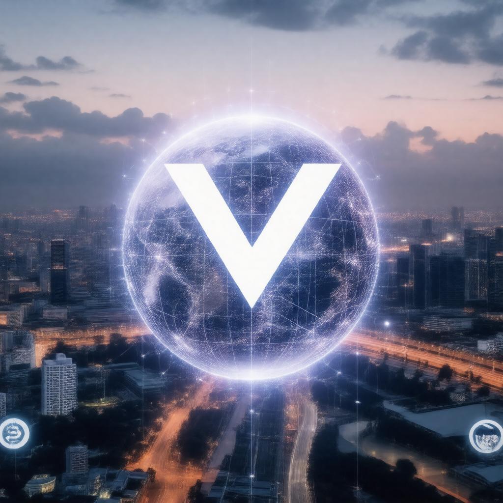 "Generate an image of the VeChain (VEN) cryptocurrency logo or a visual representation of the VeChainThor blockchain, with a subtle background hinting at supply chain management, such as a faint image of a globe with interconnected lines, in a futuristic and sleek style, with a Singaporean cityscape in the background, and a Binance or Bittrex exchange logo subtly integrated, symbolizing its trading presence."