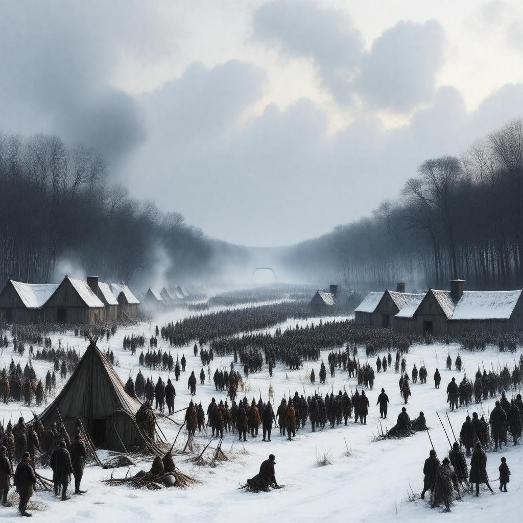 "Generate a realistic image of a historic winter landscape, depicting the Continental Army's encampment at Valley Forge, Pennsylvania, during the harsh winter of 1777-1778. Include in the scene a sprawling camp of wooden huts, with soldiers huddled around fires, and in the distance, the imposing figure of Washington's Headquarters. Incorporate a misty, snow-covered terrain, with bare trees stretching towards the horizon. The National Memorial Arch is visible in the background, under a somber, grey sky. Style: a serene, yet somber, historical landscape painting, reminiscent of 18th-century American art."