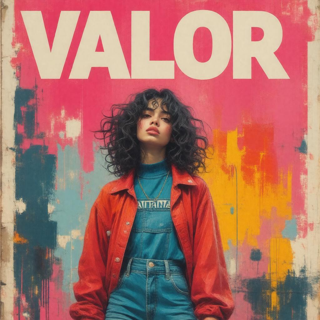 Generate an image of a vibrant and dynamic music album cover representing the song "Valor" by Aitana, incorporating elements that reflect the pop genre and Spanish culture, with bold typography and colors that evoke a sense of confidence and empowerment, set against a stylized backdrop that suggests a strong and modern aesthetic.