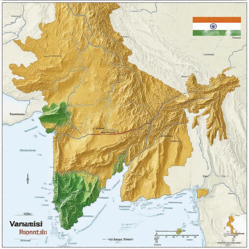"Generate an image of a map of Varanasi North constituency, highlighting its location in Uttar Pradesh, India, with a realistic and detailed representation of the region, incorporating elements that signify its status as a parliamentary constituency, such as the Indian flag or a symbolic representation of the constituency's significance."