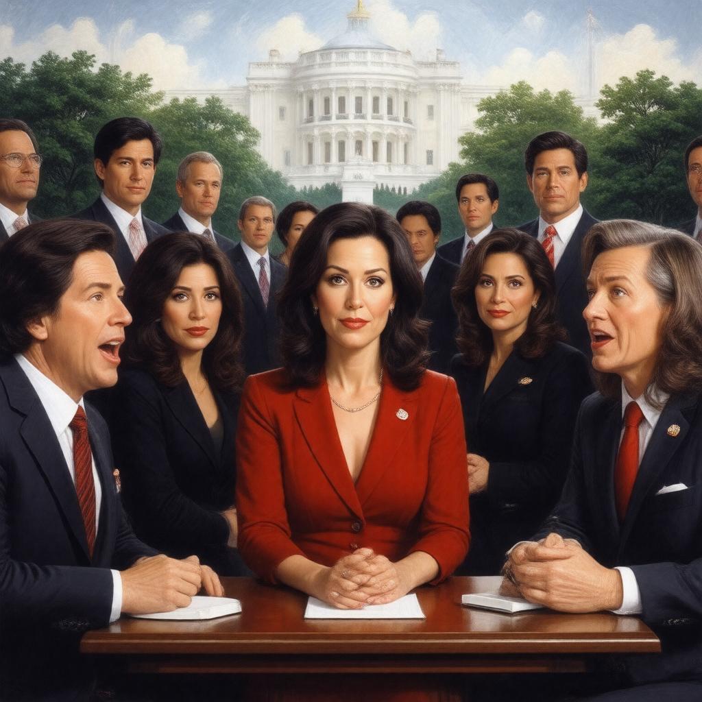 "Generate an image of the HBO television series Veep, depicting a comedic scene of Selina Meyer, played by Julia Louis-Dreyfus, in a satirical moment, surrounded by her team in a Washington, D.C. setting, reflecting the show's themes of politics and comedy."