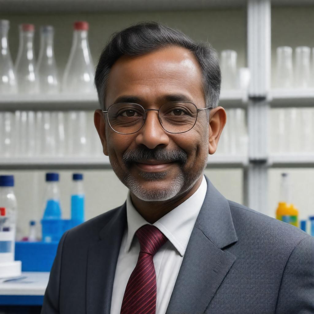 "Create a realistic portrait of Venkatraman Ramakrishnan, a middle-aged man with a gentle smile, wearing formal attire, in a laboratory setting with subtle hints of molecular biology and structural biology in the background, incorporating elements that reflect his Indian heritage and British nationality, with a warm and approachable demeanor, reminiscent of a prominent scientist and Nobel laureate."