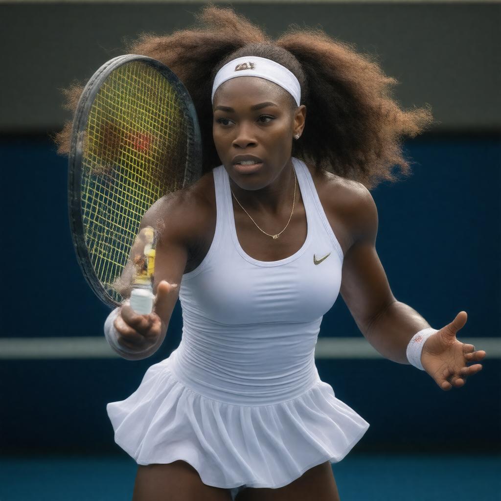 "Generate a realistic portrait image of Venus Williams, a renowned American professional tennis player, in action on the tennis court, wearing her signature athletic attire and displaying her powerful serve, with a bold and confident expression, in a style that captures her dynamic personality and athletic prowess."