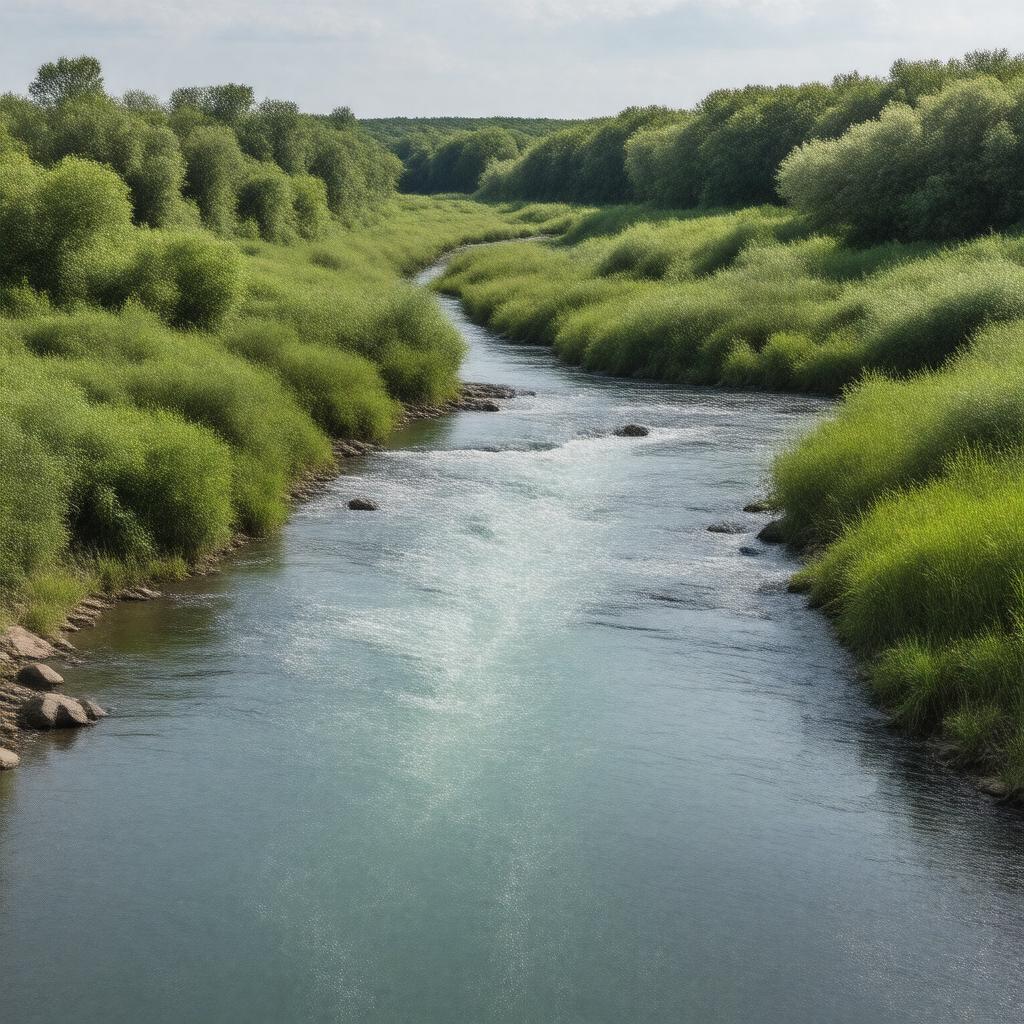 "Generate an image of a serene river flowing through a landscape with lush greenery and possibly some industrial or historical elements, representing the Verdigris River, a 310-mile-long river in the United States, specifically in Kansas and Oklahoma, with a basin size of about 12,200 square miles, featuring the Oologah Dam and Oologah Lake, in a realistic style."