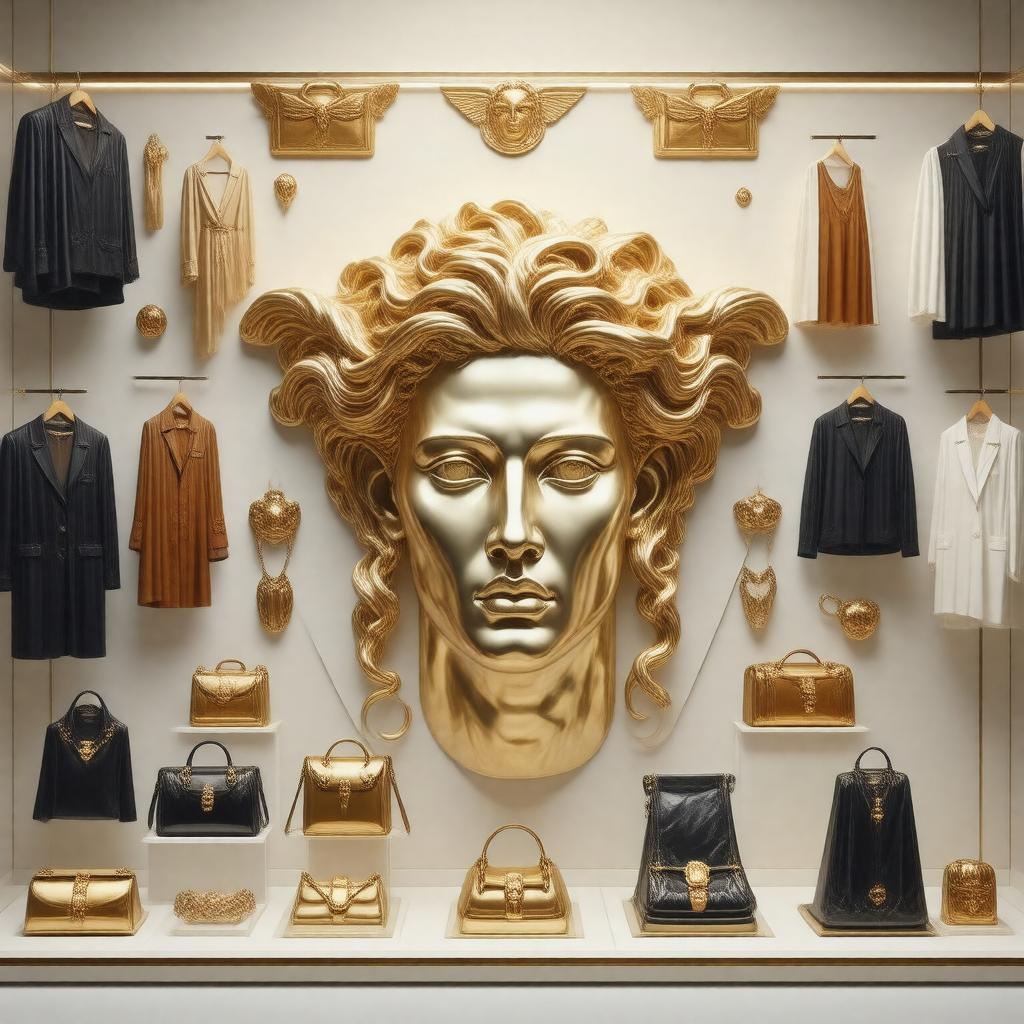 "Generate an image of the iconic Medusa head logo of Versace, a luxury goods brand, set against a sleek and sophisticated background, surrounded by high-end clothing and accessories, in a style that exudes opulence and glamour, reflecting the brand's Italian heritage and its reputation for bold and daring designs."