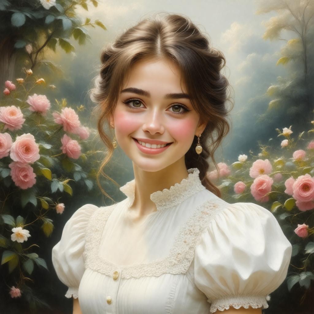 Generate a realistic portrait of a young woman with a bright smile, representing the given name Vicky, in a classic English garden setting with a subtle floral pattern in the background, evoking a sense of elegance and charm.