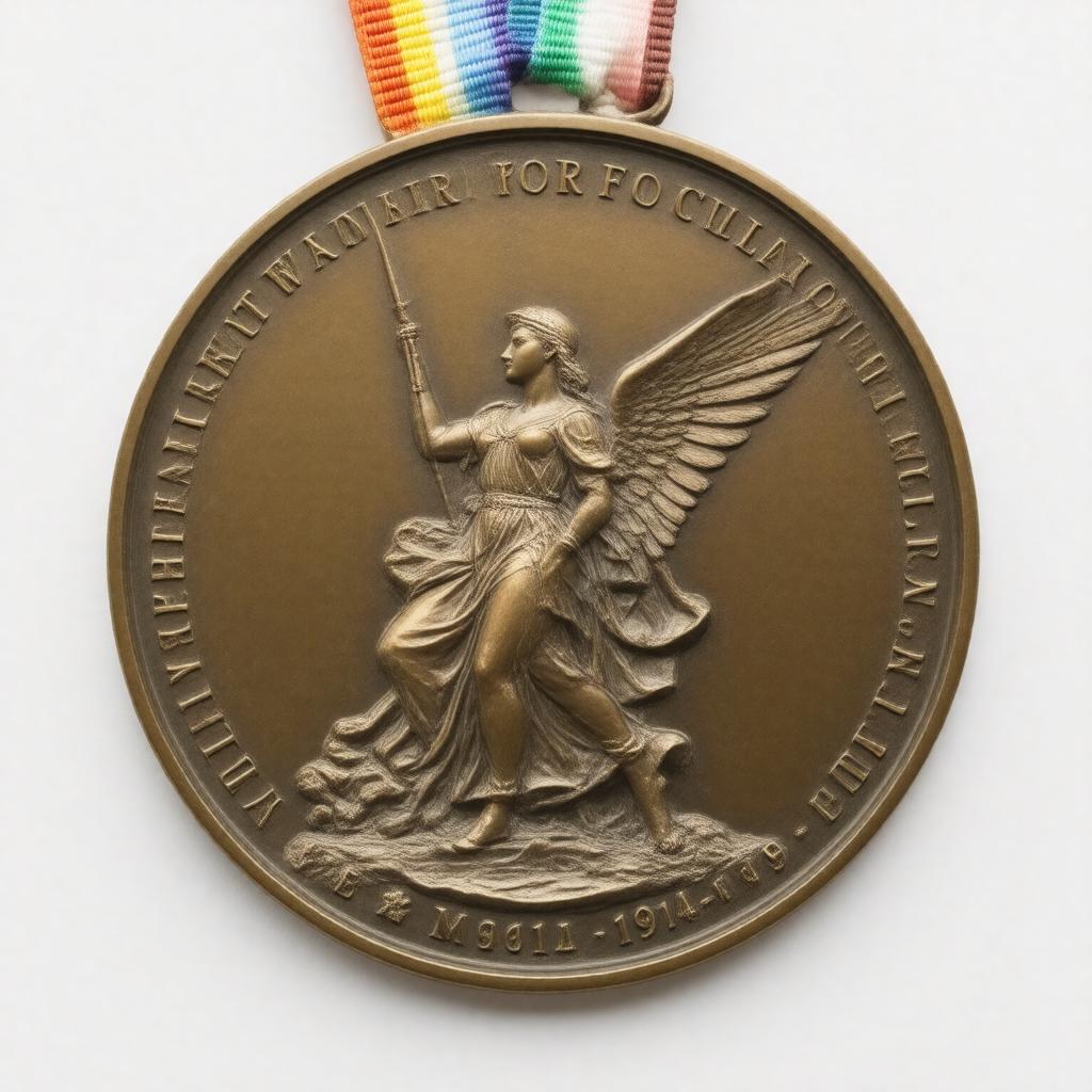 Generate an image of a circular, bronze military decoration, 36 mm in diameter, featuring a winged figure of Victory on the obverse, with the inscription 'The Great War for Civilisation 1914–1919', and a rainbow-colored ribbon, representing the Victory Medal awarded for service in World War I by the United Kingdom and other Commonwealth countries.