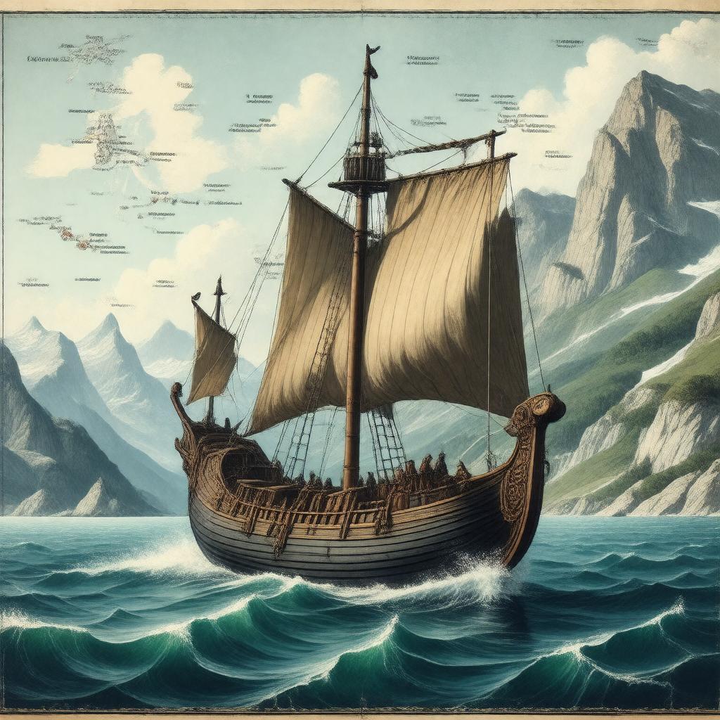 "Generate an image of a Viking longship sailing through the fjords of Scandinavia, with a map of Europe and the North Atlantic in the background, highlighting the various locations of the Viking expansion, such as the British Isles, Iceland, Greenland, and North America, in a stylized Norse-inspired illustration style."