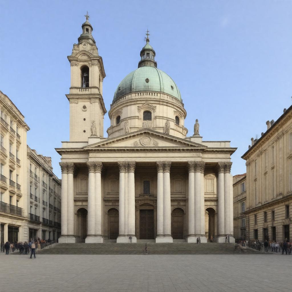 Generate an image of a grand Neoclassical cathedral with a large portico and a tall belfry tower, situated in a historic city center. The cathedral's façade features statues of Saint Stanislaus, Saint Helena, and Saint Casimir. The building has a symmetrical design with a central dome and a row of columns supporting the portico. In front of the cathedral, there is a large public square with some people walking around. The cathedral is surrounded by historic buildings and has a majestic presence in the cityscape. The image should be realistic and showcase the architectural details of the Vilnius Cathedral.