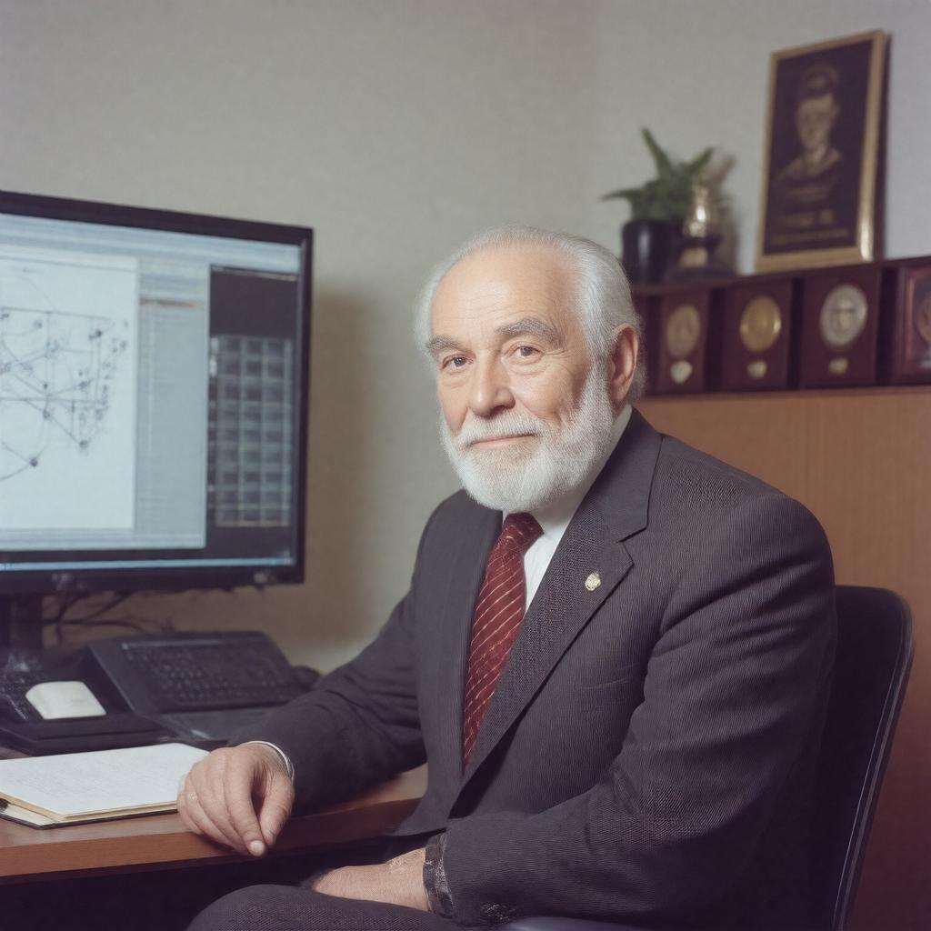 "Create a realistic portrait of Vinton Cerf, a renowned computer scientist and Internet pioneer, sitting in front of a large screen displaying a network diagram, with a thoughtful expression and a subtle hint of a smile, wearing a suit and tie, with a few awards and medals visible on a nearby shelf, in a modern office setting with a California landscape in the background."