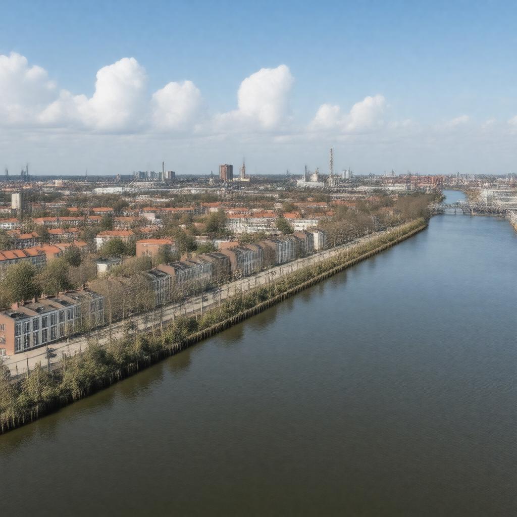 "Generate a realistic image of Vlaardingen cityscape, showcasing its modern architecture, waterfront along the Nieuwe Maas, and vibrant atmosphere, set against a clear blue sky with a few puffy white clouds, incorporating subtle Dutch cultural elements and a hint of industrial heritage, in a style reminiscent of a panoramic photograph."