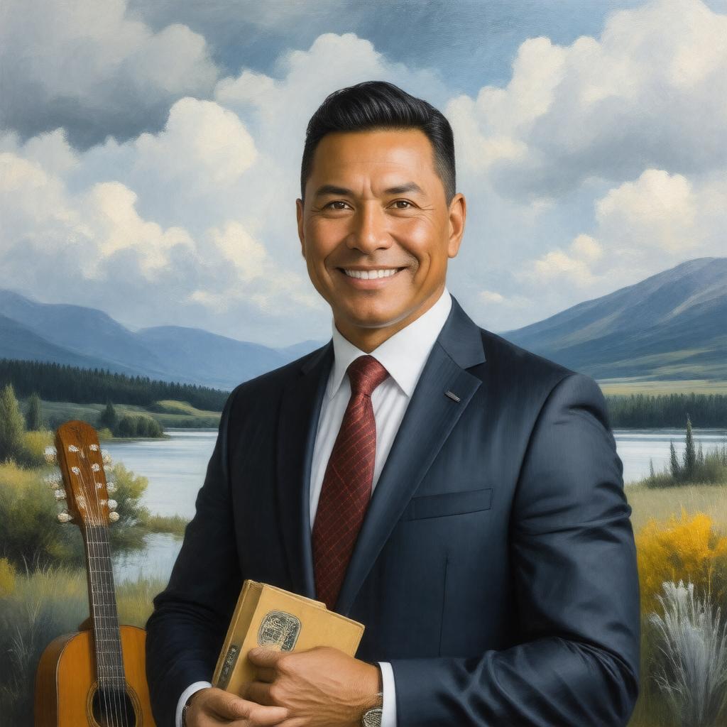 Create a realistic portrait image of Wab Kinew, a middle-aged Canadian politician, author, broadcaster, and musician of Ojibwe ethnicity, standing in front of a Manitoba landscape, wearing a suit and a warm smile, with a book and a guitar nearby, symbolizing his various occupations and achievements.