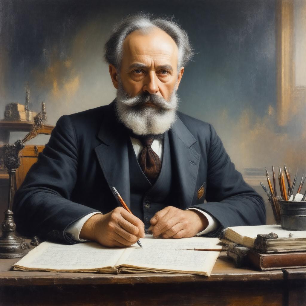 Create a realistic portrait of Wacław Sierpiński, a Polish mathematician, sitting at a desk with papers and mathematical instruments, wearing formal attire from the early 20th century, with a thoughtful expression, in a style reminiscent of classic academic portraits.