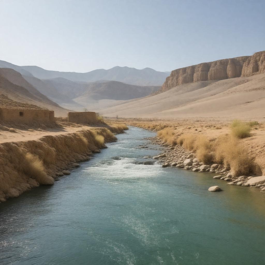 Generate an image of a serene river flowing through a valley, surrounded by arid desert landscape, with a small archaeological site in the background, depicting Wadi Shuʿayb, a river in Jordan known for its Neolithic settlement, named after Shuʿayb (Jethro), in a realistic style.
