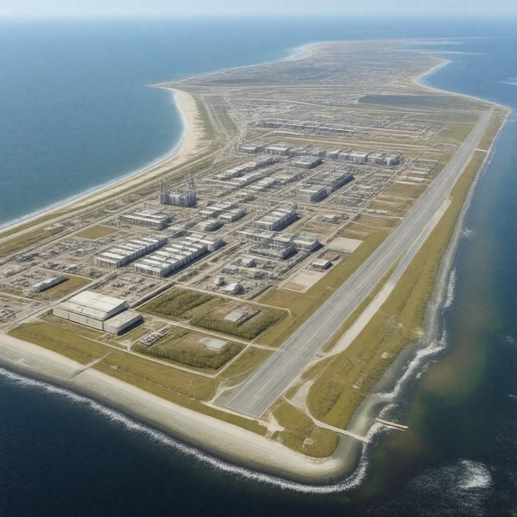 "Generate a realistic image of a large research facility located on a coastal island, with various buildings, launch pads, and radar tracking systems. The facility, Wallops Flight Facility, is situated on Wallops Island, Virginia, United States, and is operated by NASA and the Goddard Space Flight Center. Include a runway, hangars, and support buildings in the foreground, with launch pads and tracking antennas in the background. The image should convey a sense of a busy and technologically advanced space research facility."