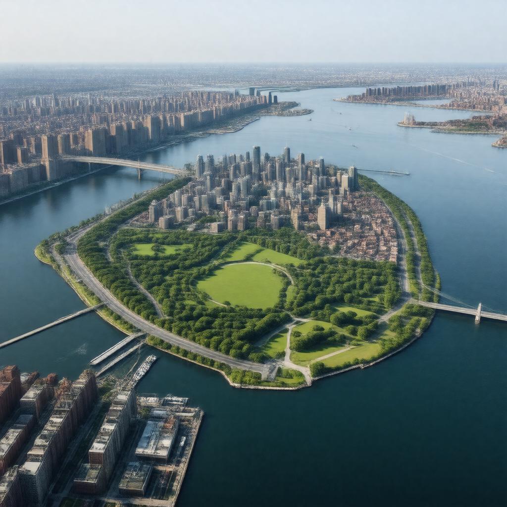 "Generate a realistic image of Wards Island, a 2.2 km² island located in Manhattan, New York City, United States, with a park and facilities, connected to Randalls Island by a bridge, showcasing its current urban landscape."