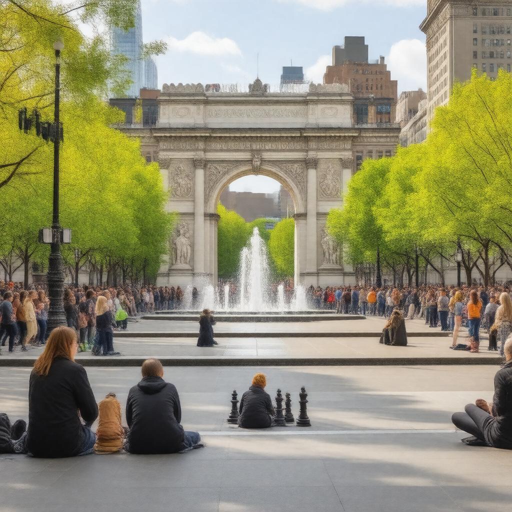"Generate a vibrant and lively image of Washington Square Park, a 9.75-acre public park located in Greenwich Village, Manhattan, New York City, United States. The image should feature the iconic Washington Square Arch, central fountain, and people enjoying the park, including street performers, chess players, and those gathered around the Giuseppe Garibaldi, Alexander Lyman Holley, and George Washington statues. The park's lush greenery and walking paths should be visible, with New York University's buildings adjacent to the park. Capture the essence of this popular public gathering spot, with its eclectic mix of people, architecture, and natural beauty, in a realistic and colorful style."