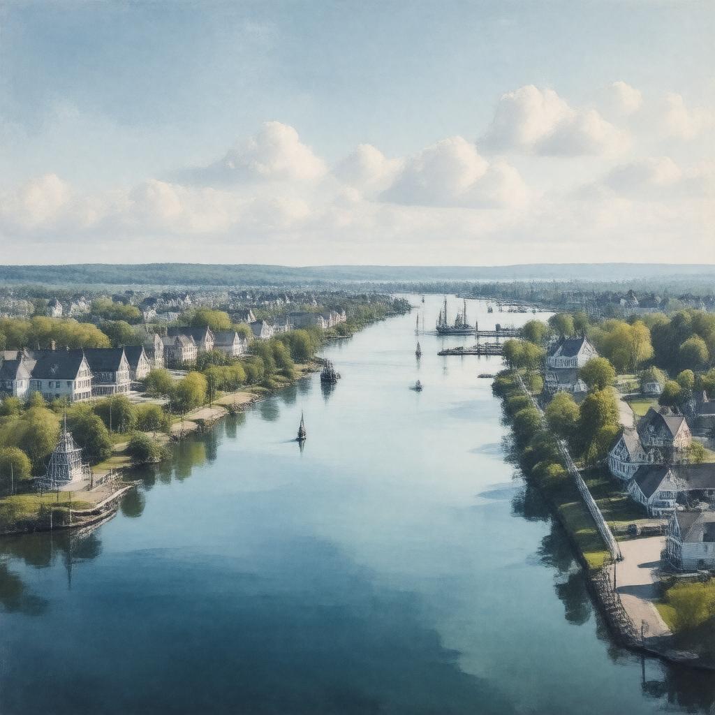 Generate a realistic image of a 2.5-mile-long river flowing through the cities of Peabody and Salem, Massachusetts, United States, and emptying into Salem Harbor, with a serene landscape and possibly some boats or ships in the harbor, in a watercolor or landscape photography style.