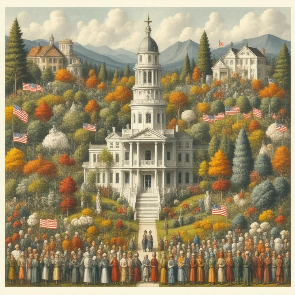 "Create an image representing the White American ethnic group, taking into account their diverse ancestries and cultural backgrounds. Depict a vibrant and inclusive scene showcasing a collage of elements that reflect their major ancestries, such as European-style architecture, American flags, and subtle nods to various cultural traditions. The style should be realistic, yet warm and inviting, conveying a sense of community and shared identity. Consider incorporating symbolic elements that reflect their history, values, and contributions to American society."