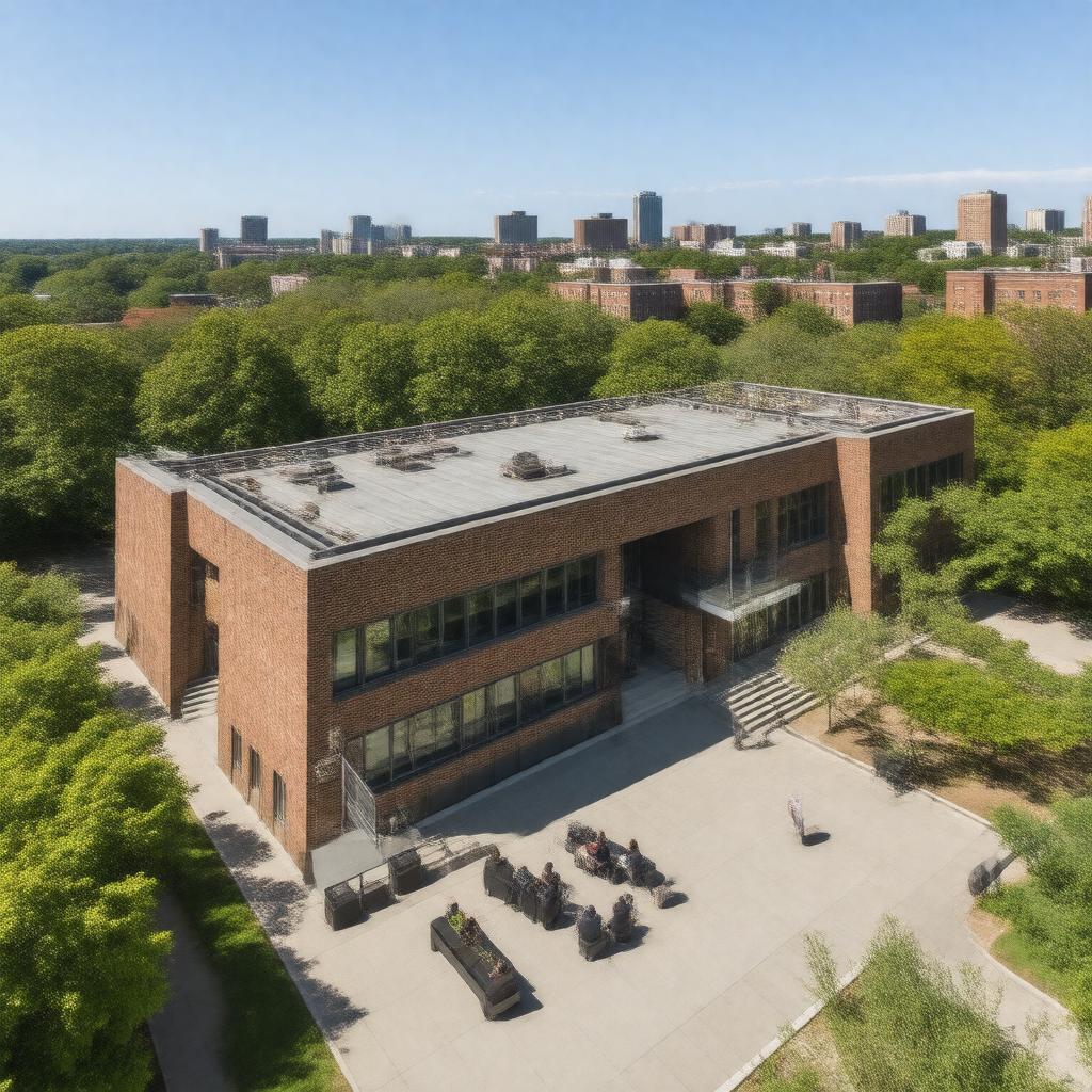 "An aerial view of the Whitehead Institute, a non-profit research institute located at 455 Main Street, Cambridge, MA 02142, with a modern architectural style, surrounded by lush greenery, and a few researchers working in the courtyard, with the Massachusetts Institute of Technology (MIT) buildings visible in the background, under a clear blue sky with a few clouds, in a realistic and professional style."