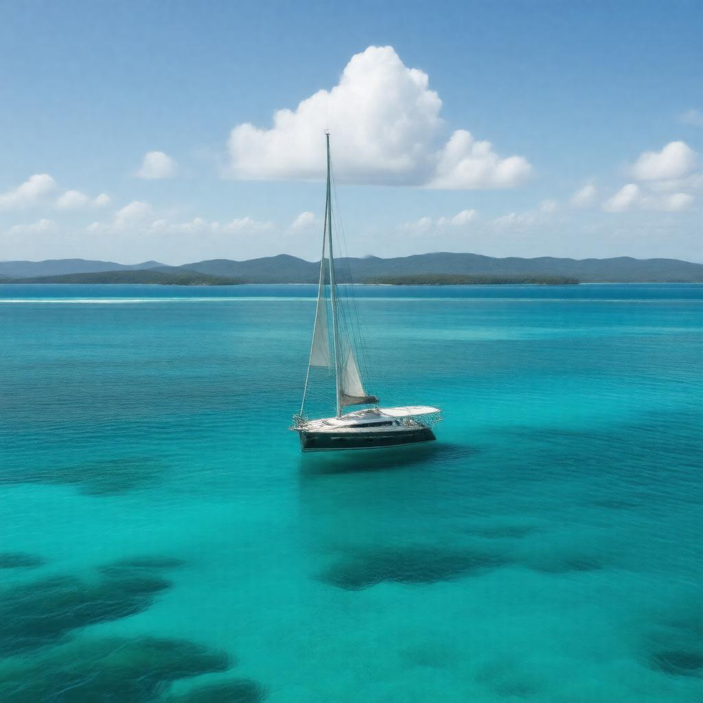 "Generate an image of a serene and picturesque view of the Whitsunday Islands, showcasing a sailboat gliding through the turquoise waters, surrounded by a few of the 74 islands, with the Great Barrier Reef visible in the distance, under a bright blue sky with a few puffy white clouds, in a realistic and photorealistic style."