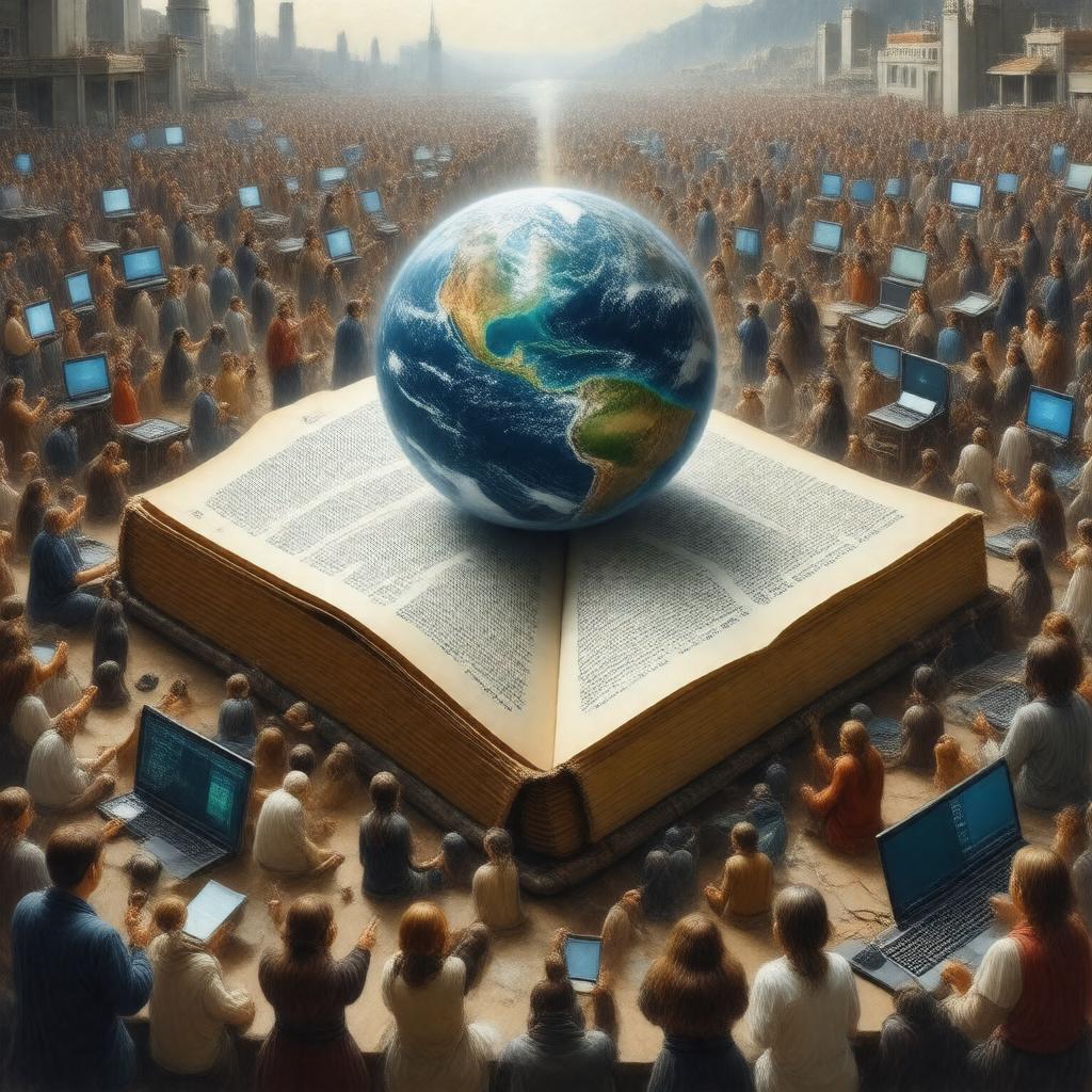 "Generate an image of a large, open book with a globe on top, surrounded by diverse people from different cultures using computers and laptops, with a subtle background of a cityscape, representing the multilingual and free nature of Wikipedia, a online encyclopedia."