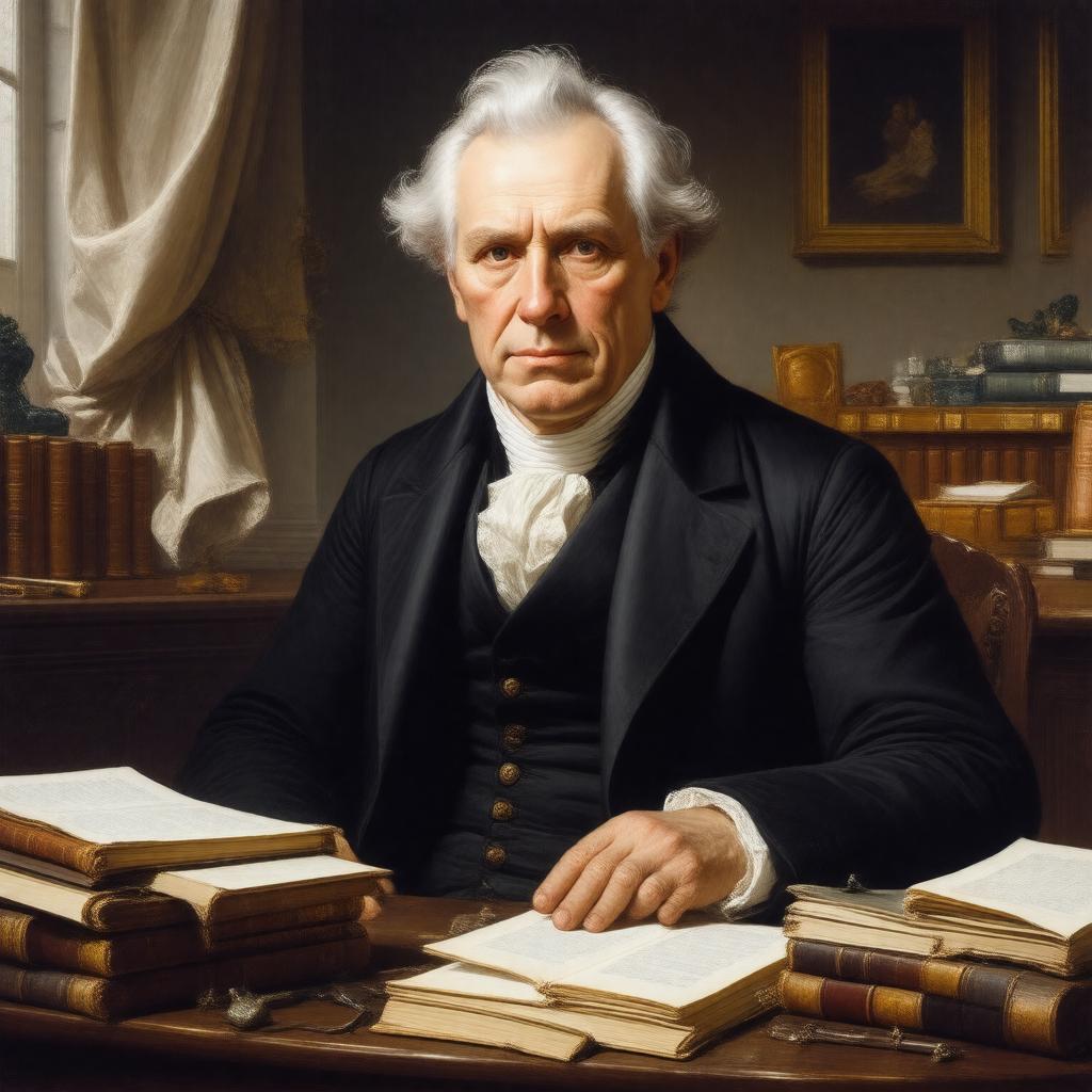 Create a realistic portrait of Wilhelm von Humboldt, a 18th-19th century German philosopher, linguist, and educational reformer, sitting in a study with books and papers around him, wearing formal attire typical of his time, with a thoughtful expression, in a neoclassical style reminiscent of the era.