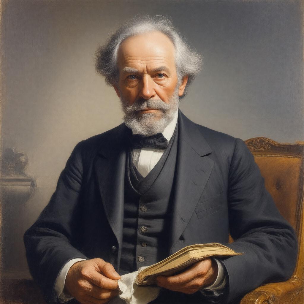 "Create a realistic portrait of William Ewart Gladstone, a prominent 19th-century British politician, in a formal Victorian-era setting. He should be depicted wearing a well-tailored suit and holding a book or papers, conveying his intellectual and literary pursuits. Incorporate subtle hints of his four terms as Prime Minister and his notable contributions to education, civil service, and Irish Home Rule. The style should reflect the realism of John Everett Millais or George Frederic Watts, who famously painted him. Include a dignified and introspective expression, capturing his influential personality."