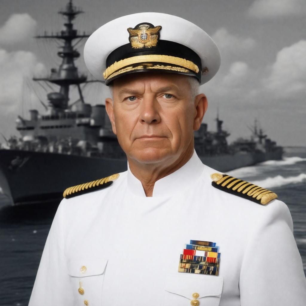 Generate a realistic image of a middle-aged man in a formal United States Navy Admiral uniform, standing in front of a naval ship or a backdrop representing the United States Navy, with a stern yet authoritative expression, symbolizing his role in Operation Crossroads and his distinguished naval career, circa 1940s.