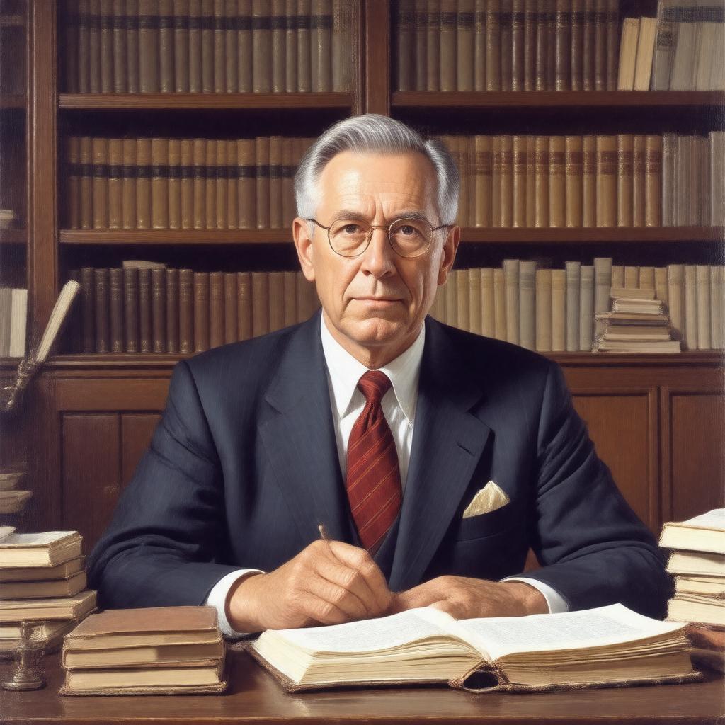 Generate a realistic portrait of William Kaye Estes, a middle-aged American psychologist with a gentle expression, wearing a suit and tie, sitting in a library or study with books and papers around him, conveying a sense of intellectual curiosity and authority in the field of psychology.