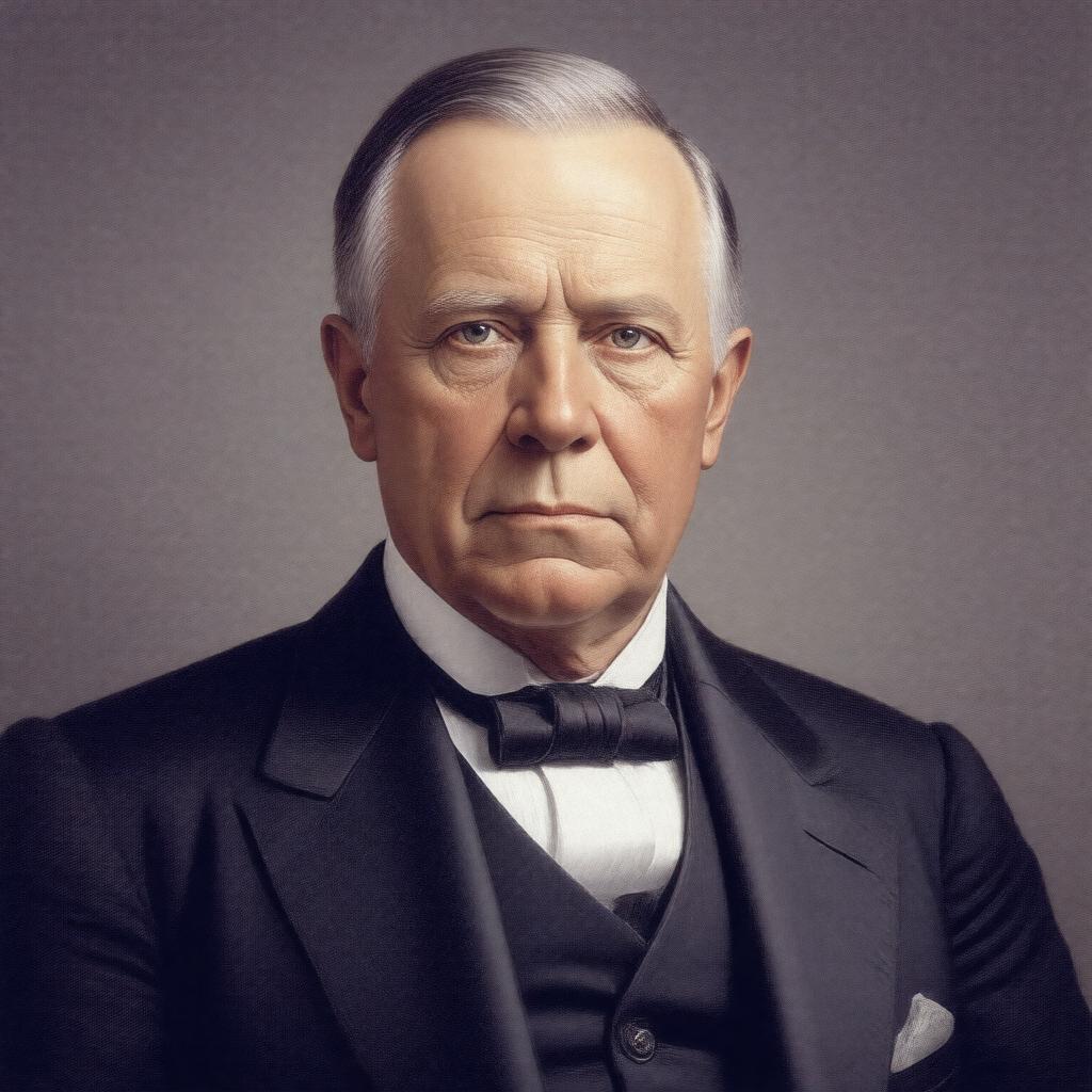"Generate a realistic portrait of William McKinley, the 25th President of the United States, sitting in a formal suit and tie, with a gentle expression, in a style reminiscent of late 19th-century American presidential portraits."