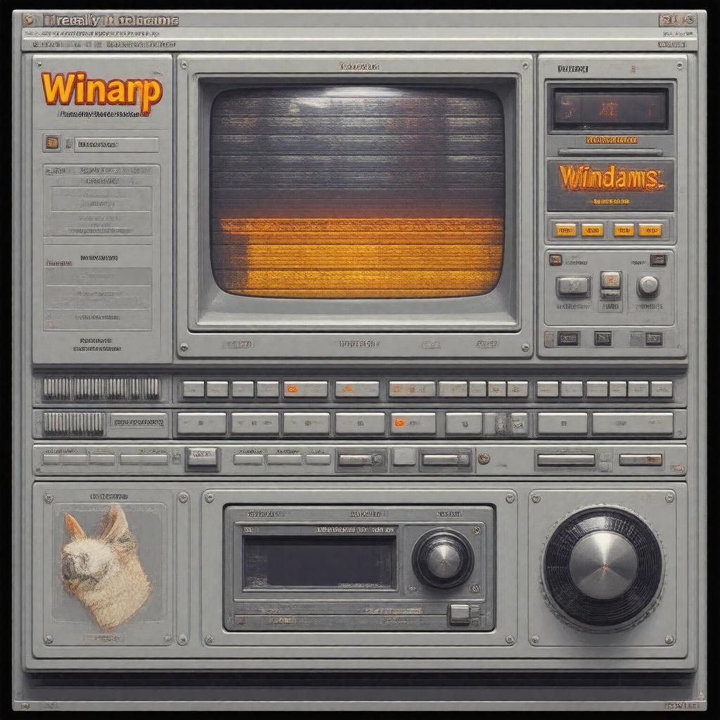 "Generate an image of a nostalgic desktop music player interface with a customizable skin, visualizations, and a playlist, representing Winamp, a popular Windows multimedia software, circa 1997, with its signature logo and slogan 'It really whips the llama's ass!' in a retro-futuristic style."