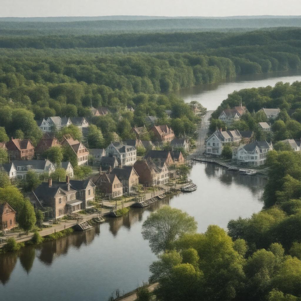 "Generate a realistic image of a charming New England town nestled between two rivers, with a mix of historic and modern buildings, surrounded by lush greenery, representing Winsted, a city located in Litchfield County, Connecticut, with a population of 7,321, showcasing its quaint downtown area and scenic riverfront."