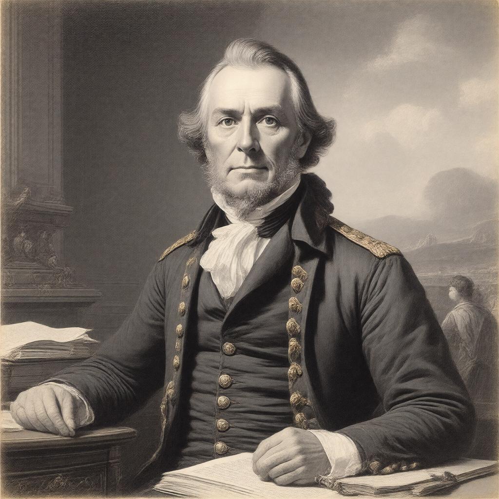 Create a realistic portrait of Winthrop Sargent, a 18th-century American politician, soldier, and writer, dressed in formal attire befitting his rank as Major in the Continental Army and Governor of the Mississippi Territory, set against a backdrop that subtly suggests his roles, such as a desk with papers, a military uniform, or a view of a 18th-century American landscape, in a neoclassical style that reflects the era's influence on American art and architecture.