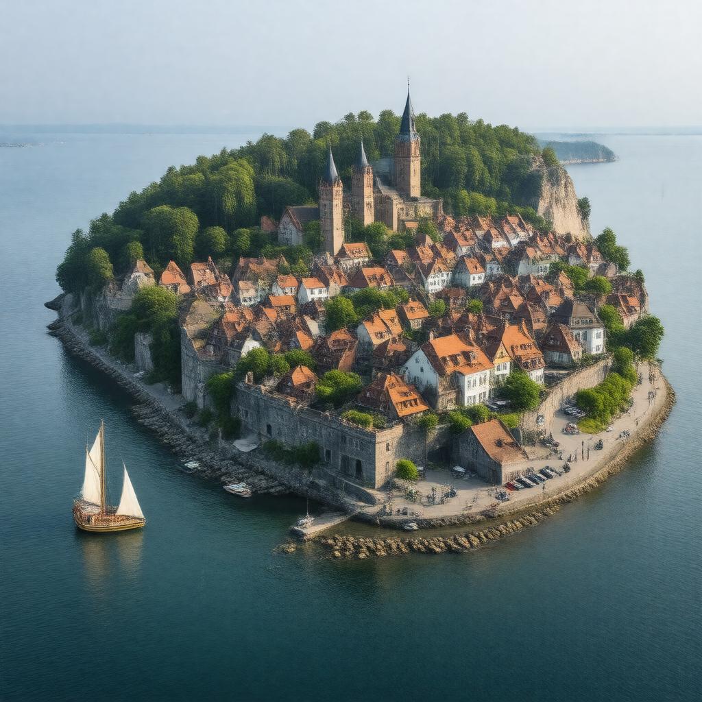 Generate a realistic image of a charming coastal town situated on a scenic island, with a medieval town center, colorful buildings, and a waterfront promenade, surrounded by lush greenery and with a few sailing boats in the nearby waters, specifically depicting Wolin, Poland, with its characteristic Viking heritage subtly visible in the architecture or festival decorations.