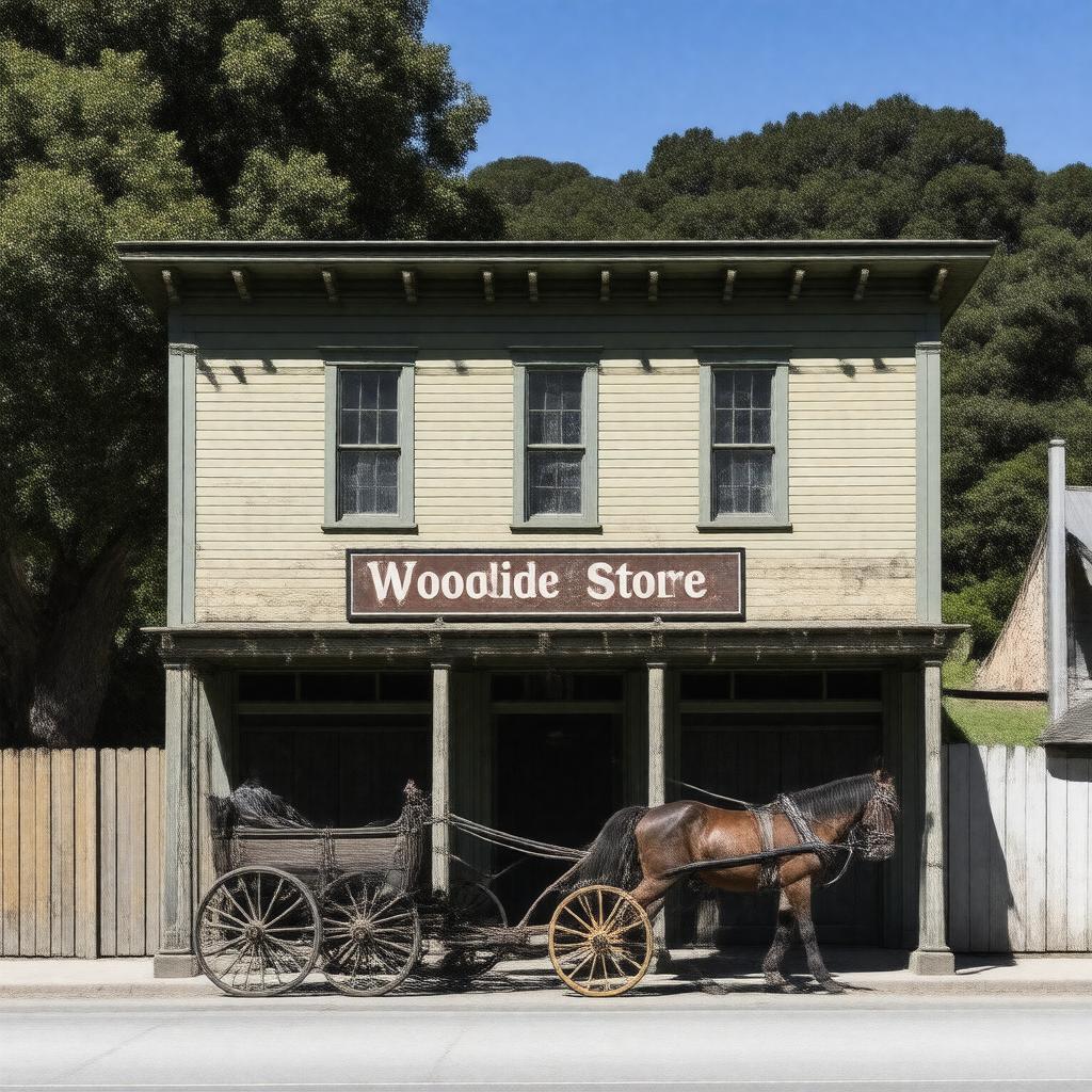"Generate an image of a historic store building, specifically the Woodside Store, located at 3300 Tripp Road, Woodside, California, in a realistic style, depicting its 19th-century architecture, with a sign reading 'Woodside Store' and a horse-drawn stagecoach in front, set against a backdrop of trees and a clear blue sky, conveying a sense of nostalgia and historical significance as the oldest surviving store in San Mateo County."