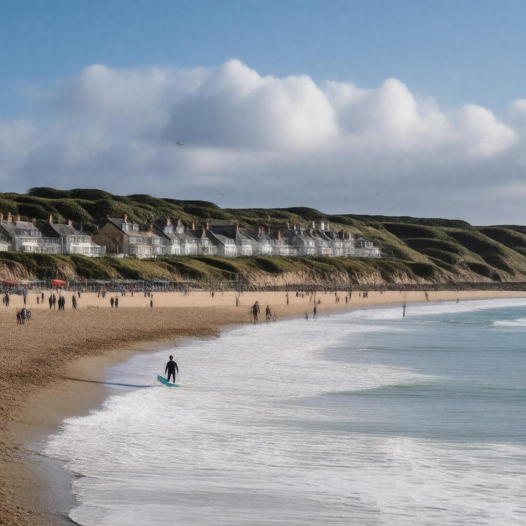 "Generate an image of Woolacombe village, showcasing its picturesque coastal scenery, with Woolacombe Beach in the foreground, surrounded by hotels, holiday parks, and other accommodations, with a few surfers riding the waves and people strolling along the beach, under a sunny sky with a few seagulls flying overhead, in a realistic and inviting style."