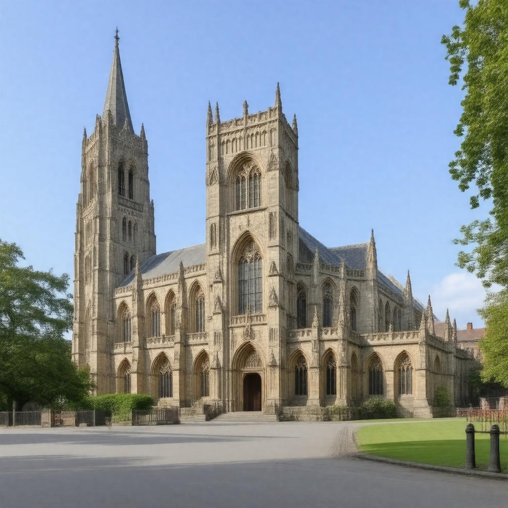 "Generate an image of Worcester Cathedral, a majestic Grade I listed building and iconic cathedral in Worcester, England, showcasing its stunning Norman and Gothic architectural styles, with a tall tower and intricate stone details, set against a clear blue sky, with the cathedral's facade and cloisters prominently displayed."