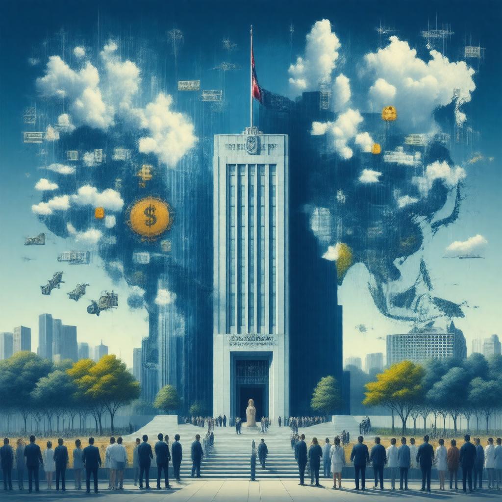 "Create an image of the World Bank Group headquarters in Washington, D.C., with a stylized representation of global development and poverty reduction in the background. The image should feature a prominent building with a flagpole flying the World Bank Group flag, surrounded by diverse individuals from around the world, with a subtle incorporation of currency symbols, infrastructure elements, and environmental motifs. The style should be a mix of modern and abstract elements, conveying a sense of hope, growth, and international cooperation. Color palette: a combination of blues and whites to represent trust, stability, and global unity."
