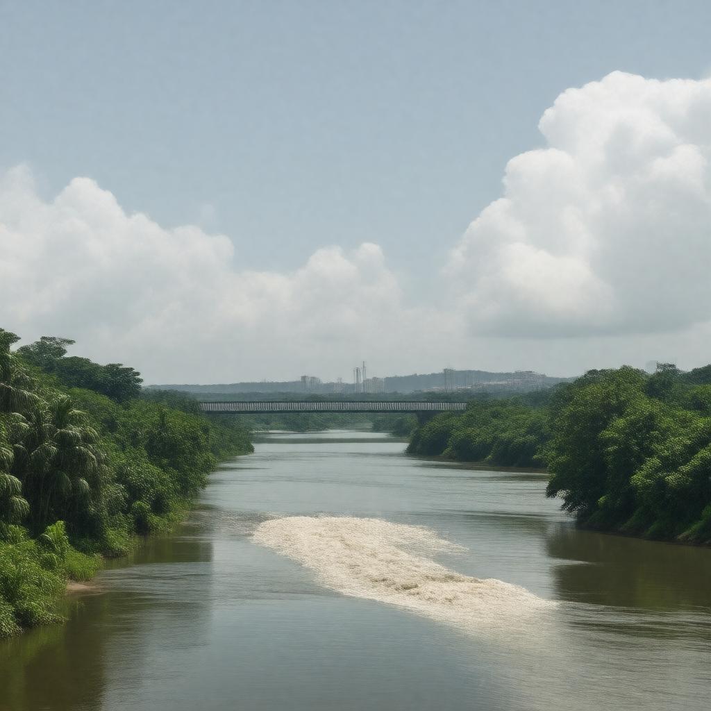 "Generate an image of a serene and scenic view of the Wouri River, a 160 km long river in Cameroon, flowing through the city of Douala, with the Wouri Bridge in the background, surrounded by lush greenery and tropical vegetation, and emptying into the Atlantic Ocean, part of the Gulf of Guinea, in a realistic and vibrant style."