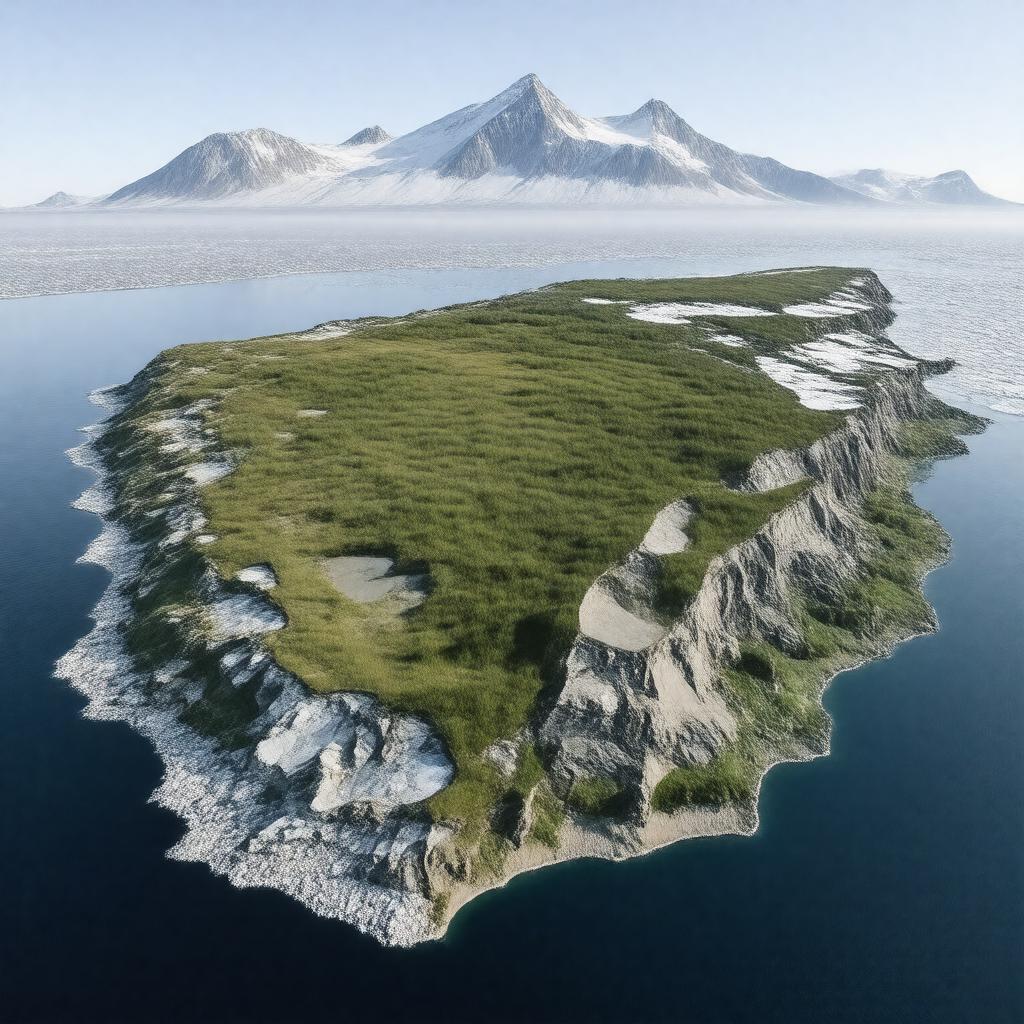 "Generate an image of Wrangel Island, a remote and uninhabited island in the Arctic Ocean, surrounded by sea ice and rugged coastline, with Mount Sovetskaya rising in the background, featuring a diverse range of Arctic flora, including grasses and low-growing shrubs, and fauna such as polar bears, walruses, and arctic foxes, under a polar climate with permafrost, in a realistic and naturalistic style."