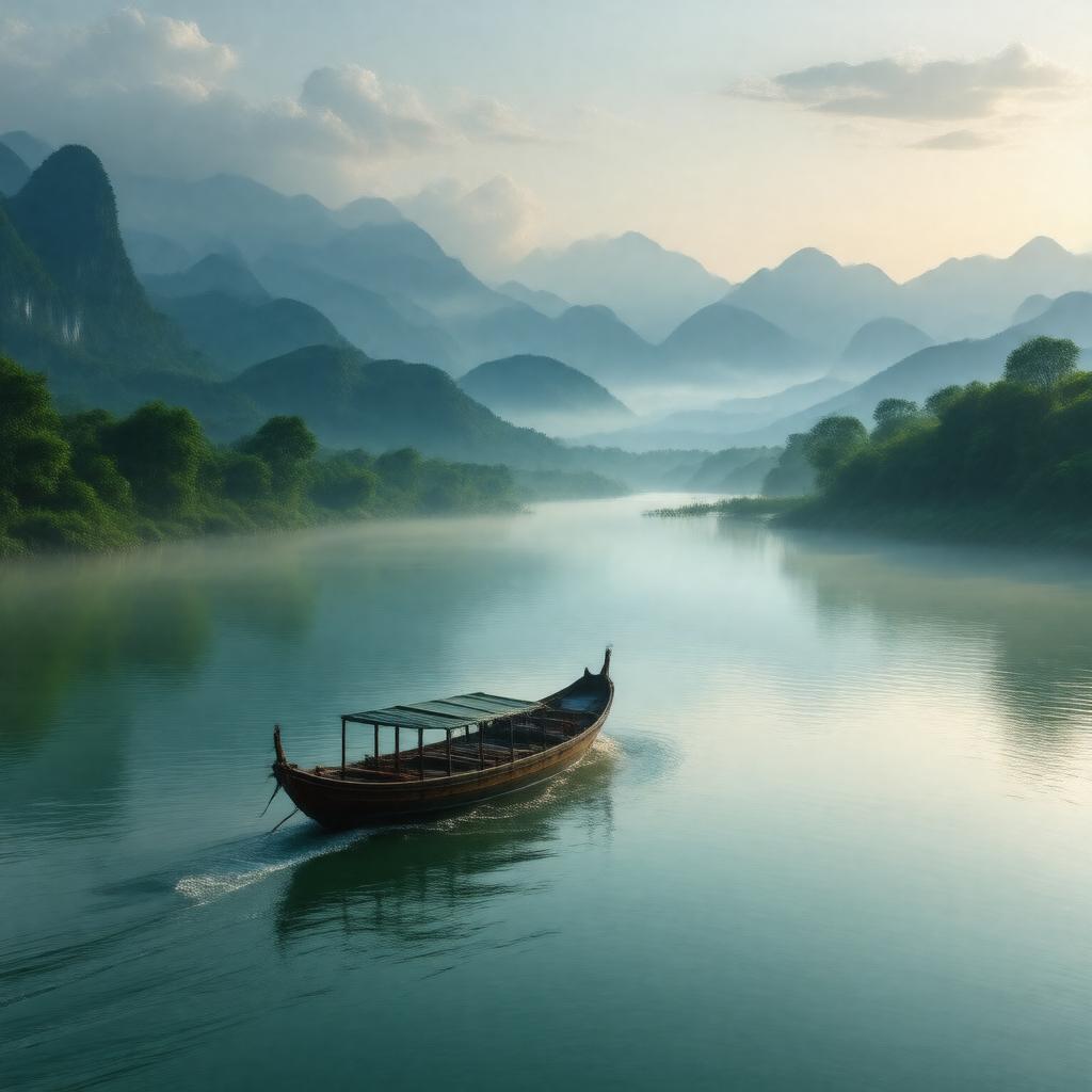 Generate an image of a serene and winding river flowing through a lush, green landscape, representing Xiang River, with misty mountains in the background and a traditional Chinese boat gently drifting on the water, under a soft, misty morning sky.