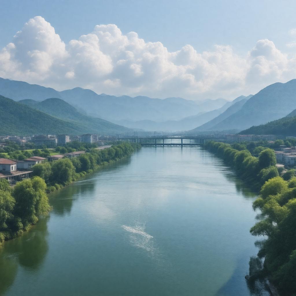 "Generate an image of a serene river landscape, featuring the Xindian River flowing through a scenic valley with lush greenery and surrounded by urban areas, with a few bridges such as the Bitan Suspension Bridge and Huazhong Bridge visible in the distance, under a clear blue sky with a few puffy white clouds, in a realistic style."